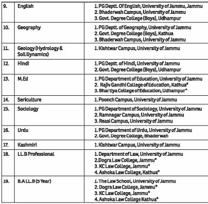 Post Graduate (PG) PROGRAMMES: Biochemistry; Biotechnology; Botany; Buddhist Studies; Chemistry; Commerce (M.Com); Computer Science & IT (MCA); Dogri; Economics; Education; Electronics; English; Environmental Sciences; Geography; Applied Geology; Geology (Hydrology And Soil Dynamics); Hindi; History; Home Science (Human Dev.); Human Genetics; Information Technology ( M.Sc IT); Kashmiri; Law (LL.B – 3 Year Professional); M.Ed.; B.Lib.I.Sc.; M.Lib.I.Sc; B.P.Ed; M.P.Ed; Mathematics; Microbiology; Physics; Political Science; Psychology; Punjabi; Remote Sensing & GIS; Rural Development; Sanskrit; Sericulture; Sociology; Statistics; Urdu and Zoology.